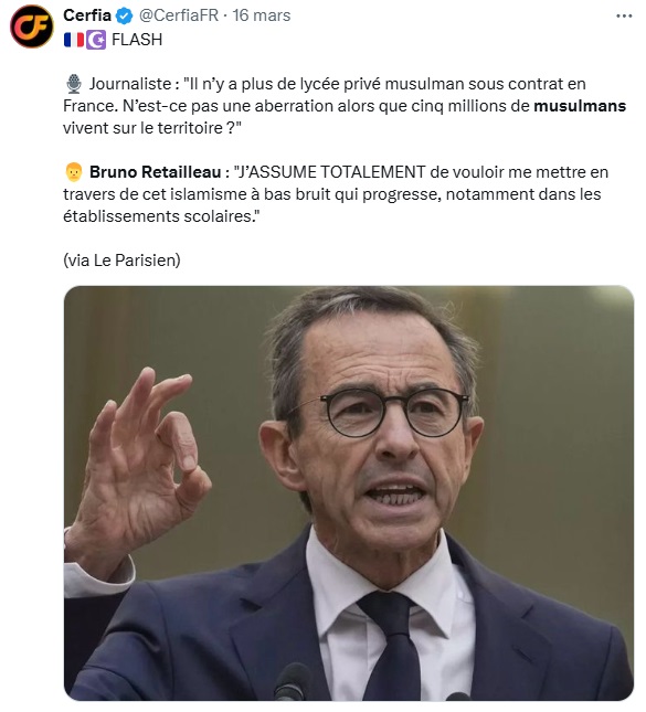 Enfin, à la question sur la disparition, en France, des lycées privés musulmans sous contrat « alors que cinq millions de musulmans vivent sur le territoire ? », le ministre s’est félicité de cette situation en assumant « totalement de vouloir me mettre en travers de cet islamisme à bas bruit qui progresse, notamment dans les établissements scolaires ».