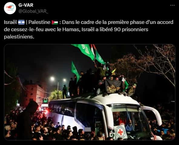 Le Comité international de la Croix-Rouge (CICR), qui a supervisé les transferts, a salué dans un communiqué l’issue d’une « opération complexe ». Au total, 1 900 Palestiniens doivent être libérés au total au cours des 42 prochains jours de cessez-le-feu, contre 33 otages israéliens retenus à Gaza. Un haut responsable du Hamas a indiqué que la prochaine libération d’otages aurait lieu samedi.