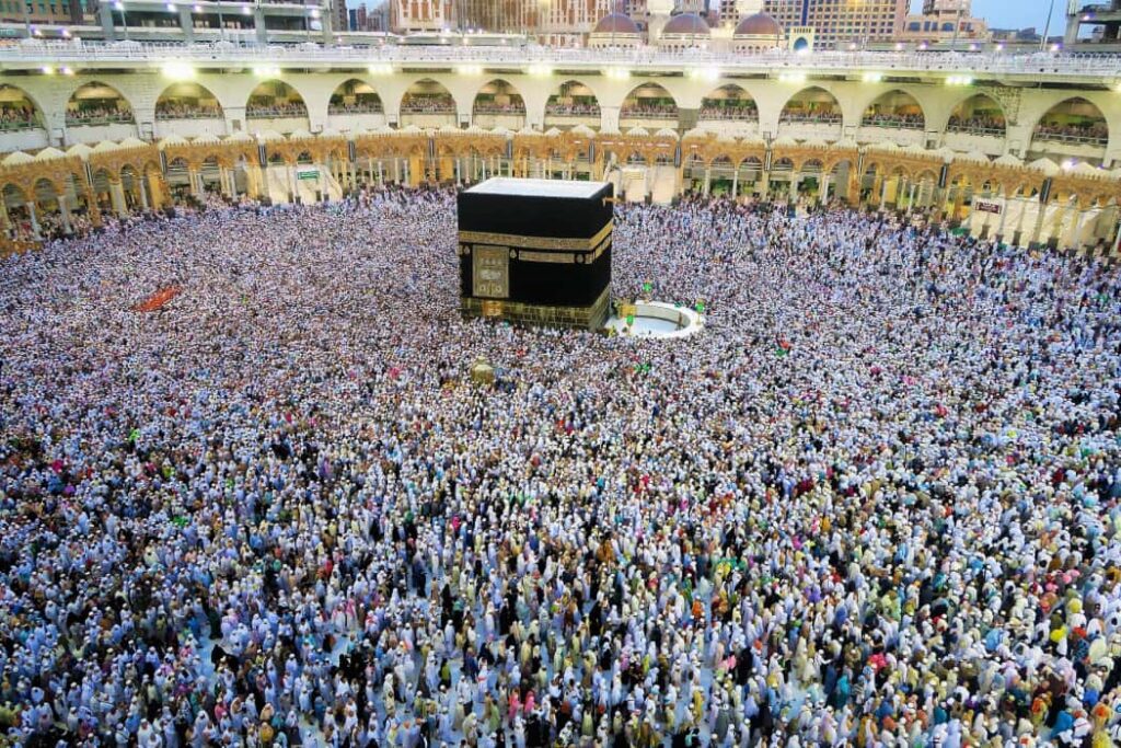 Or, comment l’islam pense-t-il la communauté et qu’est-ce que la oumma, terme le plus largement utilisé lorsqu’il s’agit de parler de communauté musulmane, a-t-elle à apporter comme plus-va lue dans la conception et la réalisation de cette communauté planétaire ?Le terme de oumma, qui apparaît 64 fois dans le Coran, désigne une communauté ou un groupe d’êtres vivants (humains et non-humains) partageant certaines caractéristiques. Il est dérivé de la racine verbale āmma, signifiant « se diriger vers quelque chose dans un certain but », « se rendre quelque part ». Ainsi, en arabe, ummatun signifie aussi un mode d’action, une manière d’agir et de se conduire, et seulement par extension une religion, par exemple dans l’expression fulān lā ūmmatan lahu (telle personne n’a pas de religion). Ainsi, la oumma permet de penser et d’activer une communauté de foi et de cœur qui émerge en tant qu’ethos (manière d’agir et de se conduire).Le pèlerinage annuel de la Mecque autour de la Kaaba.Bien qu’au niveau des états, elle ne soit pas une communauté politique en mesure d’infléchir les décisions qui concernent l’avenir de notre humanité et celui de la planète en tant qu’écosphère, car les gouvernements qui la dirigent sont très largement complices d’un ordre mondial néolibéral, extractiviste, et impérialiste, la oumma résiste en tant que communauté vertueuse.