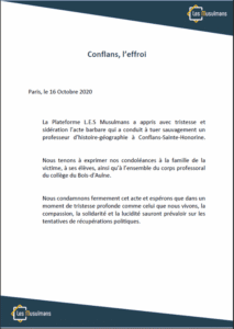Les mots ont manqué parfois, la douleur était toujours présente. Le choc, après l’assassinat terroriste abject du professeur Samuel Paty par un extrémiste russe d’Evreux, a ébranlé les consciences de la communauté musulmane française.Du côté des représentants des institutions musulmanes d’abord.Mohamed Moussaoui, président du CFCM.Le président du Conseil français du culte musulman Mohamed Moussaoui a exprimé son émotion chez nos confrères de L’Opinion.« L’assassinat abject du professeur d’histoire au collège Le-Bois-d’Aulne à Conflans-Sainte-Honorine vient nous rappeler la triste réalité avec laquelle nous devons composer et vivre au quotidien : celle des irruptions du terrorisme se réclamant de l’islam, une « pandémie » mondiale féroce qui fait des victimes de tous âges, de toutes conditions et de toutes convictions. Les musulmans de France sont horrifiés par ce crime abject, un nouvel affront à leur foi et à leur religion. Quoi de plus affligeant, de plus révoltant et de plus offensant que de voir notre propre religion dévoyée et instrumentalisée pour tuer nos propres concitoyens ? »Même consternation chez Musulmans de France (ex-UOIF). « C’est avec sidération que nous apprenons l’assassinat barbare d’un enseignant du collège du Bois d’Aulne de Conflans Sainte Honorine (…) Il est absolument inadmissible que des individus emplis de haine associent de près ou de loin l’islam à leur folie meurtrière (…) Cette épreuve est un drame pour toute la nation et nous ne cesserons de soutenir les victimes du terrorisme et de dénoncer toute atteinte de nos concitoyens au nom de notre religion. »