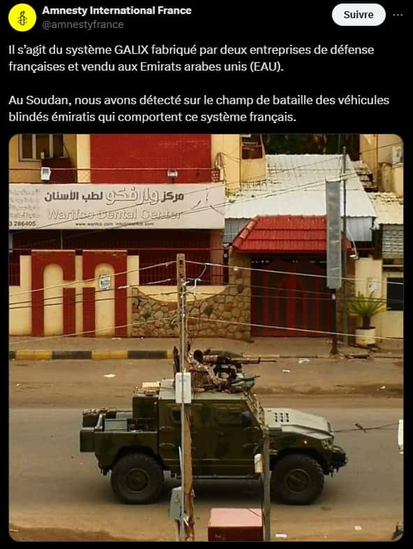« Le système Galix est déployé par les FSR dans ce conflit, et toute utilisation au Darfour constituerait une infraction évidente à l’embargo sur les armes de l’ONU. Le gouvernement français doit veiller à ce que Lacroix Defense et KNDS France cessent immédiatement de fournir ce système aux Emirats arabes unis »