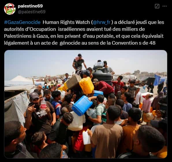Human Rights Watch (HRW) estime que la faim, la déshydratation et les maladies, en particulier celles transmises par l’eau contaminée, ont probablement « causé la mort de milliers de Palestiniens à Gaza », en plus des plus de 45 000 morts rapportés par le ministère de la Santé du Hamas. L’ONG déclare que les mesures israéliennes témoignent d’une « volonté d’extermination ».