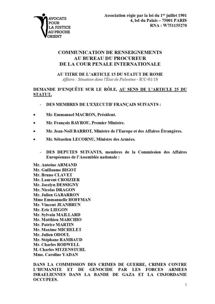 Enfin, la plainte précise que si la demande d’enquête est pour l’instant limitée aux membres de l’exécutif et aux députés français, « cela ne préjuge cependant pas d’une saisine ultérieure concernant d’autres ministres, élus du Parlement, voire des élus locaux, dirigeants de médias publics ou privés, dirigeants de groupes de lobbying déclarés ou non déclarés, et dirigeants d’associations ayant justifié, encouragé ou prêté assistance à la commission des crimes dans le Territoire Palestinien Occupé par l’armée israélienne ».