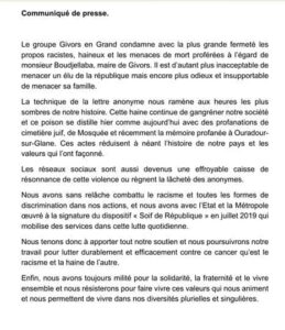Il s’appelle Mohamed Boudjellaba et depuis deux mois, il est le nouveau maire de Givors, une commune à proximité de Lyon.Le 21 août, l’homme reçoit une lettre de menace de mort. « Allez fous le camp bougnoule si tu ne veux pas brûler comme 1 merguez », « on sait encore se servir d’1 mitraillette », « tu sais comment ça fait une bombe dans une habitation, ça fait boum ». Les propos suintent la haine et déroulent quatre pages durant une même mécanique de rejet.Le maire de Givors a révélé ce courrier sur les réseaux sociaux et a annoncé avoir immédiatement saisi le procureur de la République ainsi que le préfet.Les condamnations et les messages de soutien politique n’ont pas manqué de se manifester.Le ministre de l’Intérieur Gérald Darmanin a exprimé son écœurement. Le Garde des Sceaux a lui aussi vivement condamné les menaces de mort. Même condamnation du préfet du Rhône. A Givors, l’ex-maire Cristiane Charnay a témoigné sa solidarité à Mohamed Boudjella.Elu avec seulement 29 voix au deuxième tour des municipales de Givors le 28 juin dernier, battant l’ex-maire communiste Cristiane Charnay, Mohamed Boudjella avait mis un terme à 67 ans de gestion du PCF dans cette ville.Le nouveau maire avait également battu le candidat du Rassemblement national (ex-FN) Antoine Mellies qui était pourtant arrivé second au premier tour.A lire aussi :