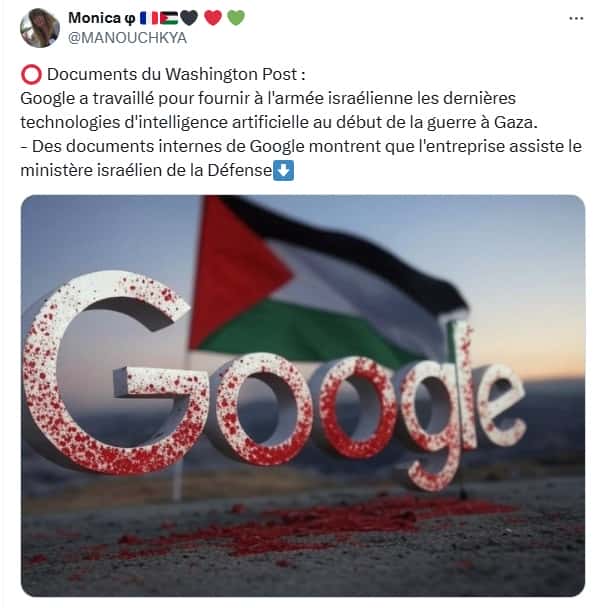 Un article du Washington Post, publié mardi, rapporte que Google a fourni à l’armée israélienne un accès à ses technologies d’intelligence artificielle (IA) les plus récentes dès le début du génocide israélien à Gaza. Dès le début de la guerre en octobre 2023, un employé de Google aurait sollicité une extension d’accès pour le ministère israélien de la Défense, selon des documents obtenus par le journal.