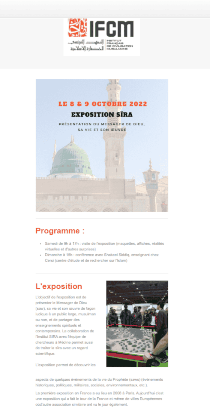 Du côté des membres de l’Institut Sira et de sa direction, joints par Mizane.info, on a une autre version des évènements.Tout commence il y a un an. L’institut Sira est invité à présenter son exposition sur le Prophète à la mosquée du Cher. Selon les organisateurs, l’évènement a été un succès. Il se trouve que l’un des membres de l’assistance est le responsable événementiel au sein de l’IFCM, Hafid Sekhri. « Il nous a demandé avec insistance de présenter l’exposition à l’IFCM », confie l’un des membres de l’équipe de l’Institut Sira à la rédaction de Mizane.info.Les organisateurs réclament une demande officielle par courrier électronique. Ce qui est fait. Les détails financiers et organisationnels de l’exposition sont abordés. Un document de l’IFCM sur les droits-photos est même adressé à l’Institut Sira. Le service communication de l’IFCM prend ensuite la relève et adresse un message aux organisateurs le 27 juillet. « La chargée de communication de l’IFCM nous a demandé de lui adresser des éléments photos et historiques de l’exposition pour assurer la communication d’un évènement que l’IFCM s’annonce « très fier » de recevoir, selon les termes employés. »Dimanche dernier, un rendez-vous est pris pour monter l’exposition dans les locaux. L’IFCM communique officiellement pour annoncer l’évènement. Tout semble aller pour le mieux pour les 8 et 9 octobre, date prévue de l’exposition.Jusqu’à ce mardi 4 octobre où l’un des proches de la direction de l’Institut Sira leur apprend que l’évènement est annulé et que l’annonce de cette annulation a été faite sur les réseaux sociaux. « On a eu du mal à y croire car tout le matériel était entreposé là-bas et que nous n’avions pas été prévenus. Jusqu’à présent, nous n’avons reçu aucune réponse officielle. »