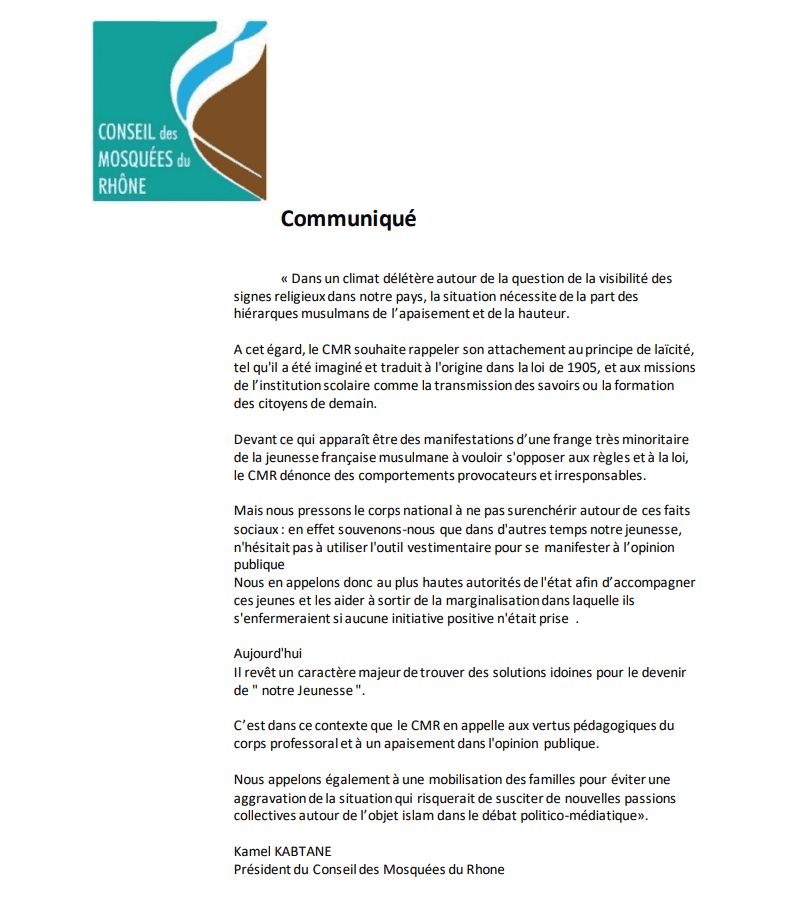 « Le Conseil des mosquées du Rhône, dit-il, a toujours pris ses responsabilités quand il le fallait, alors que beaucoup d’autres restaient silencieux. Nous l’avons montré récemment dans l’affaire Iquioussen où nous avons pris position et pris des coups. Nous ne sommes pas des supplétifs du gouvernement », précise le président du Conseil des Mosquées du Rhône.Il s’agit seulement, réitère-t-il, de dénoncer « l’utilisation identitaire de vidéos faites dans un contexte dominé par le sentiment de rejet en France ». « Nous ne sommes pas non plus contre les jeunes, ou contre le voile. Nous l’avons souligné, c’est un phénomène qui à chaque époque touche toutes sortes de jeunes. »Kamel Kabtane.Kamel Kabtane reconnait par ailleurs des dérives et des abus dans la réception sociale de certaines tenues portées par des jeunes femmes comme les jupes longues, devenues islamiques dans le vocabulaire médiatique. « Je suis d’accord sur l’existence de ces abus et je suis prêt à me battre contre ces dérives. La question du hijab ne date pas d’hier, bien avant2004 et nous nous sommes toujours mobilisés à chaque fois qu’il le fallait. Qu’on cesse cette stigmatisation à tout va sur les habits, l’alimentation. »
