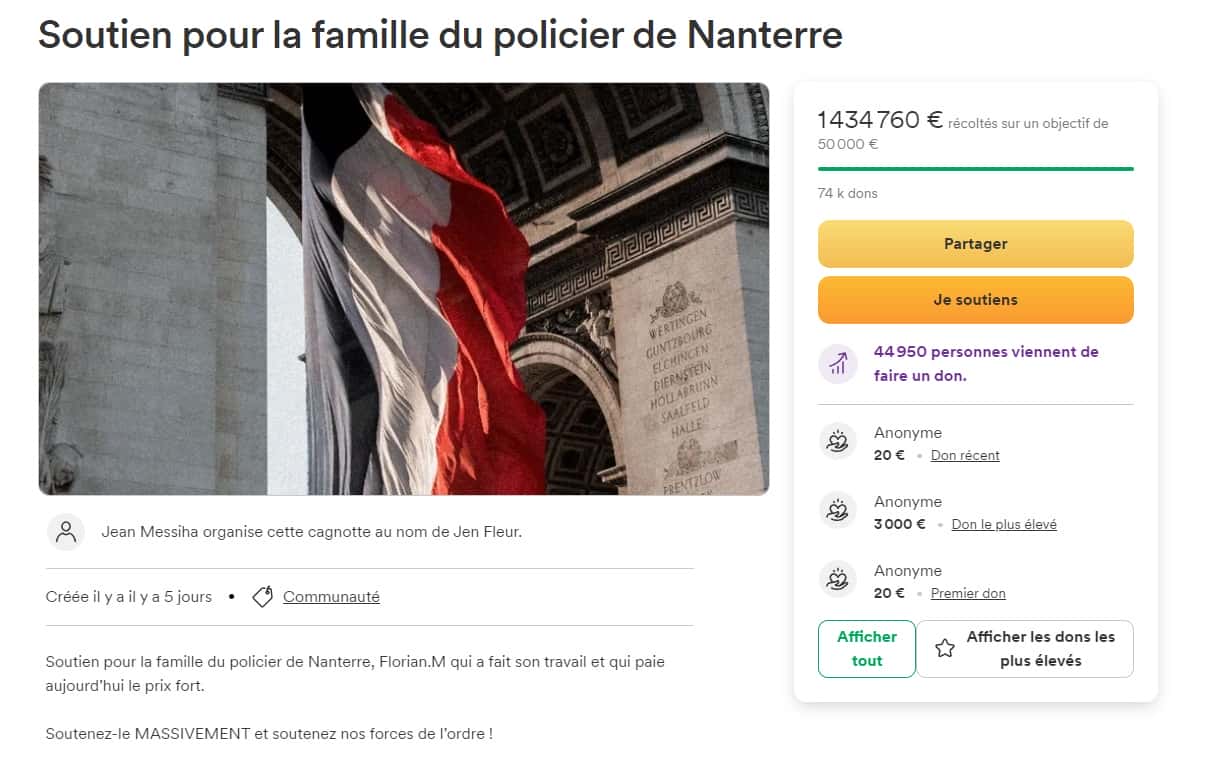 La cagnotte, ouverte par Jean Messiha en faveur de la famille du policier – responsable de la mort d’un adolescent – atteint actuellement près d’un million cinq cent mille euros.