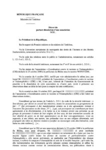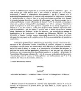 Après le CCIF, BarakaCity, plusieurs mosquées et récemment les éditions Nawa, c’est au tour de la Coordination contre le racisme et l’islamophobie d’avoir fait les frais d’une dissolution décidée par le président Macron et confirmée en conseil des ministres ce mercredi 20 octobre.En cause, selon les termes du décret, de nombreuses déclarations, pour la plupart des commentaires haineux non modérés ni supprimés des pages de l’association sur les réseaux sociaux, que le président de la République interprète comme une validation. D’autres déclarations émanant des responsables locaux de l’association C.R.I, dont certaines remontent à 2016, ont été présentées comme une incitation à la violence. Globalement, il est reproché à la CRI d’œuvrer activement à « cultiver le soupçon d’islamophobie au sein de la société française ».Mizane.info reproduit l’intégralité des documents du décret ci-dessous :Sur son compte Twitter, la CRI a commenté cette décision en ces termes : « C’est une preuve manifeste de l’islamophobie officielle. Ce qu’on nous reproche n’est rien d’autre que de nous exprimer librement et de défendre des victimes de l’islamophobie. »