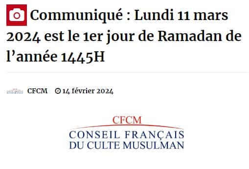 « Conformément aux données scientifiques, la conjonction de la nouvelle lune de Ramadan 1445H aura lieu le 10 mars 2024 à 10h00 (heure de Paris) », adoptant depuis 2013 les critères de calcul, le CFCM a déclaré que le premier jour du mois de Ramadan sera le lundi 11 mars 2024 :