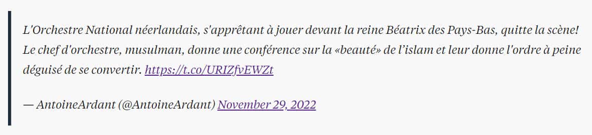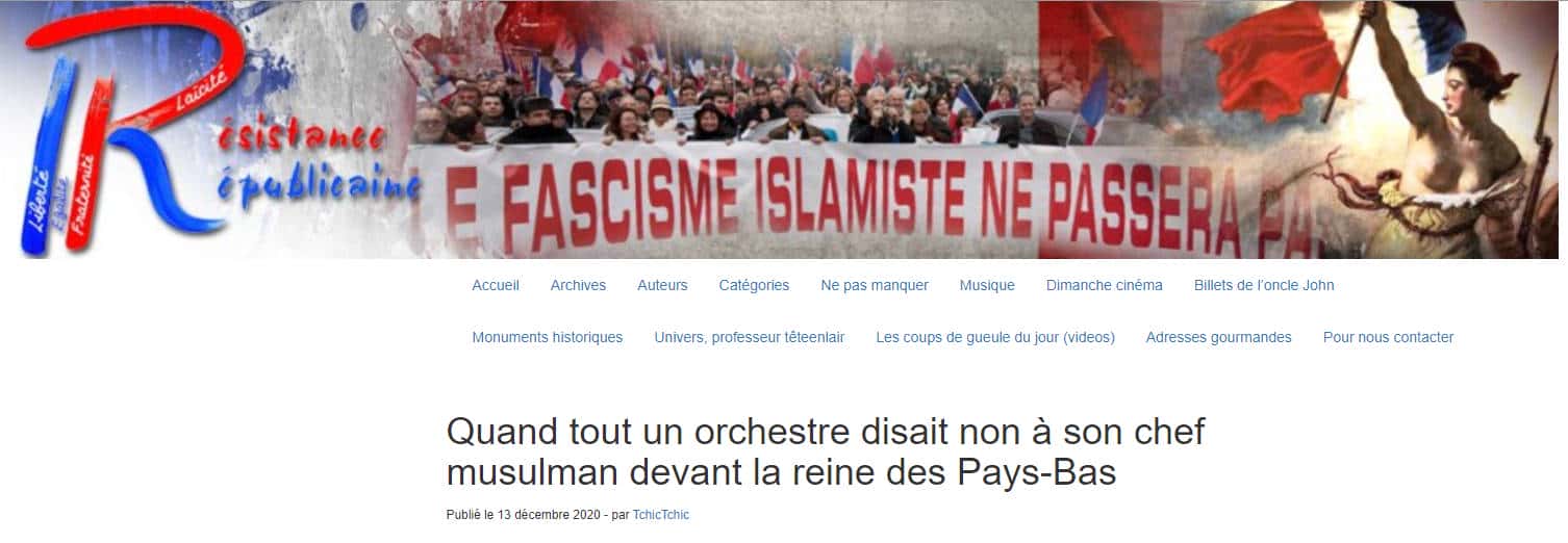 L’histoire de cette fake news se passe aux Pays-Bas. Selon le site Résistance Républicaine qui l’a rediffusé en décembre 2020, un chef d’orchestre musulman aurait, sous les yeux de la reine Béatrix, pris la parole en présentant au public un discours de type prosélyte les invitant à croire à la beauté du message de l’islam.