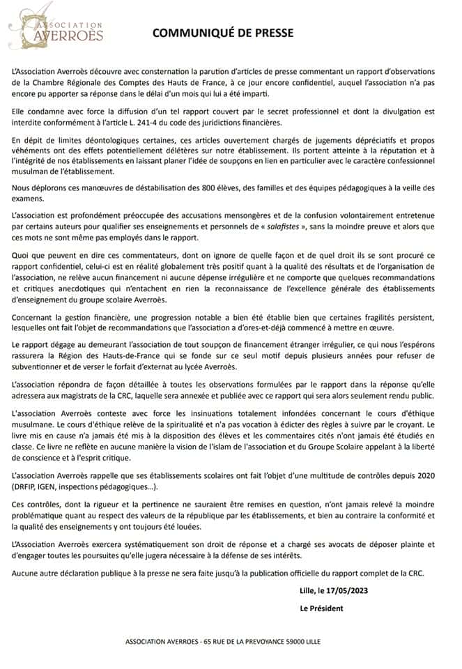 Devenu en 2008, le premier lycée musulman sous contrat d’association avec l’Etat français, l’établissement Averroès – reconnu pour son « excellence académique » avec ses 100 % de réussite au Bac – a fait l’objet d’un rapport de la chambre régionale des comptes des Hauts-de-France (CRC) évoquant la gestion financière « critique » de l’établissement.