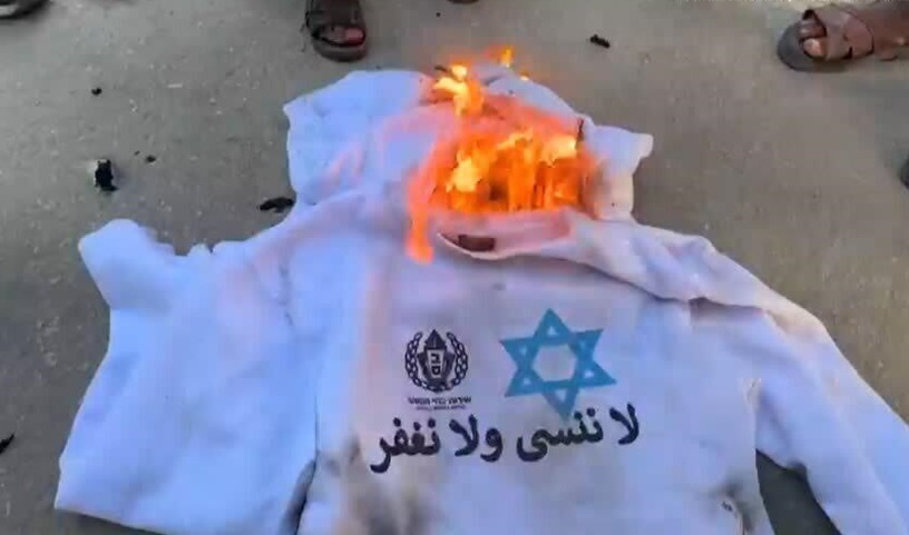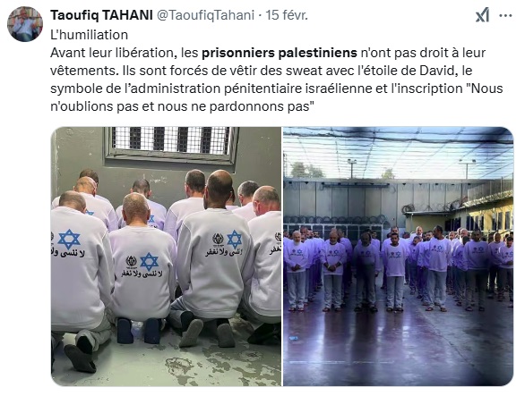 Une scène symbolique et dramatique juste avant leur libération, l’administration pénitentiaire israélienne a publié des images montrant les détenus palestiniens à genoux, vêtus de survêtements floqués d’une étoile de David et de l’inscription en arabe : « Ni oubli, ni pardon ». Une autre image montrait un grand groupe de prisonniers habillés de la même tenue derrière des barreaux, certains pieds nus.