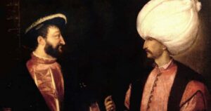 Fondé en 1299, l’empire Ottoman ne connaîtra sa gloire imposante qu’à partir du 15ème siècle avec la prise de Constantinople. Alors que l’empire Ottoman vit son « âge d’or »[2], Souleymane le Magnifique prend une décision (entre autres facteurs) qui mettra en péril l’économie de l’empire et redéfinira les rapports de force entre l’Europe et les Sultans qui se succéderont.En effet, en 1535 le royaume de France obtînt du Sultan des privilèges commerciaux de grande ampleur, jamais consentis jusqu’à lors, et qui en profiteront bientôt par l’entremise française à d’autres puissances européennes puisque leurs échanges commerciaux et leurs finances publiques seront améliorés.François Ier et Soliman le Magnifique.Il est important de noter que ces privilèges ont été accordés alors que l’empire vivait ses moments de « gloire », il était arrivé jusqu’aux portes de Vienne, et il venait ensuite de sauver la France (à sa demande) des griffes de Charles Quint.Pour certains historiens, ces privilèges auraient été motivés par le désir de l’empire de peser sur la politique du continent européen.Ces accords, c’est-à-dire « ces privilèges accordés aux étrangers au sein de l’empire Ottoman ont été offerts de plein gré », écrit effectivement Rachid Rédha dans al-manâr, mais quand l’empire faiblit sensiblement et tentera de remettre en cause ces accords, ce sont les puissances européennes qui lui signifieront une fin de non recevoir.Notons que ces privilèges ont concerné aussi les chrétiens de l’empire favorisant un rapprochement avec l’Europe, jusqu’à un droit de regard stricte sur eux des autorités européennes. Le ralentissement de l’économie ottomane qui en résulte fera des européens « un gouvernement dans le gouvernement Ottoman »[3], un contre-pouvoir.Par exemple, en 1860, la France envoie ses troupes au Liban pour protéger les chrétiens contre les Druzes. Pour certains historiens, ce sont les privilèges commerciaux qui vont permettre peu à peu aux européens de s’ingérer dans les affaires ottomanes, jusqu’à devenir une « tradition politique ».