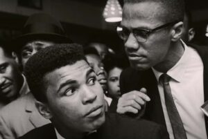 Le jeune Cassius se révélera être particulièrement doué dans son domaine. Après avoir remporté les compétitions de boxe amateure en 1959, il participera aux jeux olympiques de Rome en 1960 d’où il ressortira médaillé d’or et deviendra alors un visage célèbre aux Etats-Unis.Passé professionnel dans la foulée, il gravira les échelons et les victoires jusqu’à l’obtention de l’ultime ceinture mondiale dans la catégorie poids lourd contre Sonny Liston en 1964. Aussi bien connu pour ses poings que pour son verbe foudroyant, Cassius Clay fera de son « trashtalking » une marque de fabrique galvanisant ses plus fidèles supporters et suscitant l’hostilité de ses opposants.Le K.O de Muhammad Ali face à Sonny ListonDurant cette même année, Cassius Clay deviendra Cassius X à la suite de son adhésion à la Nation of Islam sous l’égide du sulfureux Elijah Muhammad. Le chef suprême de la Nation lui décernera par la suite le nom définitif de Muhammad Ali.Le boxeur sera alors très proche de l’un des plus influents prédicateurs du mouvement, Malcom X. Une influence qui finira par irriter Elijah Muhammad qui demandera à l’ensemble de ses disciples de boycotter le jeune prédicateur et de l’écarter du brillant boxeur Muhammad Ali.Muhammad Ali en compagnie de Malcom X