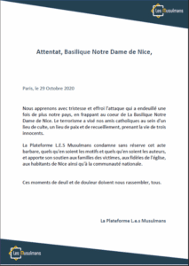 Le Conseil Français du culte Musulman (CFCM) était le premier à s’exprimer après l’effroyable assassinat de trois catholiques à Nice.« Le CFCM condamne avec la plus grande vigueur l’attentat terroriste qui a visé ce matin la basilique Notre-Dame de Nice faisant trois morts et plusieurs blessés. Le CFCM présente ses sincères condoléances aux familles des victimes et à leurs proches et souhaite un prompt rétablissement aux blessés. En signe de deuil et de solidarité avec les familles des victimes et les catholiques de France, le CFCM appelle les musulmans de France à annuler toutes les festivités du Mawlid, commémorant la naissance du Prophète Muhammad (PBSL). Le CFCM appelle également les responsables musulmans à fermer leurs mosquées jusqu’à nouvel ordre, dès ce soir après la prière de la nuit et de faire de ce dernier moment de prière l’occasion d’un hommage et d’un recueillement en la mémoire des victimes. »Pour Musulmans de France, « les églises, les temples, les mosquées et tous les lieux de culte sont des lieux de prières, de recueillement et de fraternité. C’est un crime abject et absolument inadmissible que d’y faire couler le sang au nom de Dieu. Nos cœurs sont avec nos frères et sœurs chrétiens en ces moments très douloureux. »Le Collectif contre l’islamophobie en France (CCIF) dénonce une « brutalité terroriste (qui) touche à nouveau notre pays, cette fois dans un lieu de culte et de recueillement. Le CCIF condamne cet attentat horrible. Nous devons sortir au plus vite de cette déferlante de violence et de barbarie qui touche la France. Dans ces moments de douleur et de déchirement, nos pensées sont auprès des familles des victimes, de leurs proches, de l’ensemble de nos concitoyens, ainsi que toutes les personnes mobilisées dans ce contexte d’épreuve nationale. »