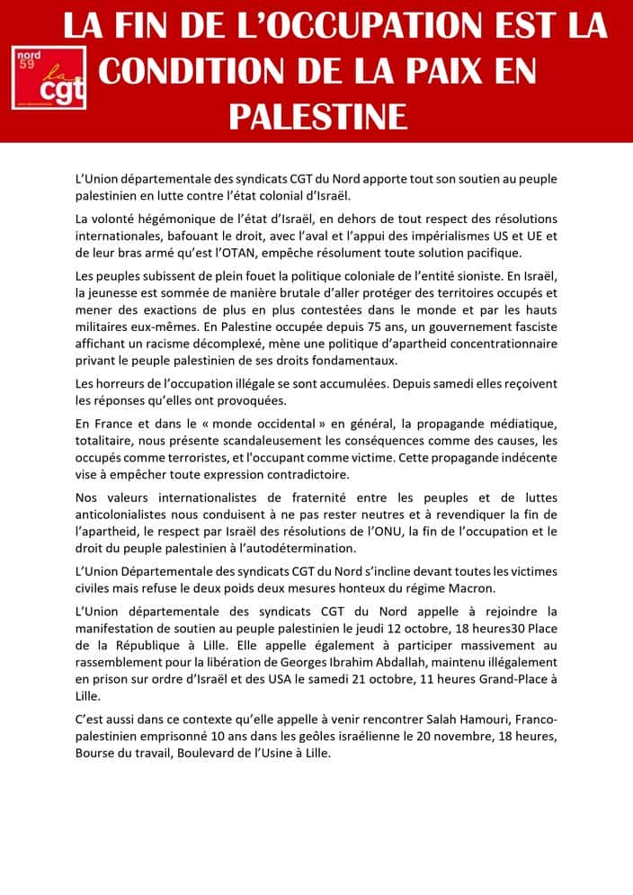 🚨 Urgent : Le responsable de l’Union Départementale de la CGT du Nord a été interpellé à 6h du matin chez lui pour « apologie du terrorisme » suite à un post de l’Union Départementale pour appeler à la paix en Palestine !