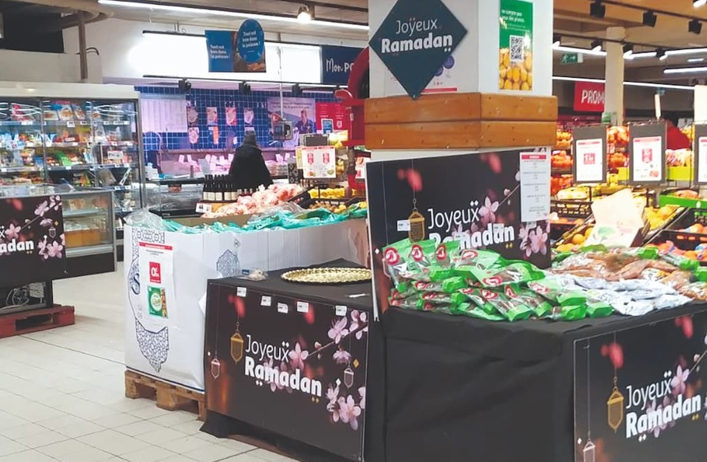 Leclerc consacre des pages entières à son « Spécial Ramadan », tandis que Cora mise sur les « Saveurs d’Orient ». En magasin, cette stratégie marketing est encore plus visible. Dans un hypermarché parisien, dès l’entrée, les clients sont accueillis par des têtes de gondole remplies de feuilles de brick et autres aliments prisés.