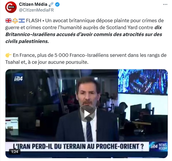 Des juristes spécialisés en droits humains au Royaume-Uni ont déposé, ce lundi, une plainte auprès de la police métropolitaine de Londres pour « crimes de guerre » et « crimes contre l’humanité ». Elle vise dix ressortissants britanniques d’origine israélienne ayant pris part au génocide perpétré par l’armée israélienne à Gaza.